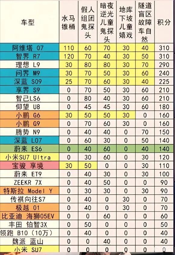 第三点,理想汽车的成绩出乎意料的表现不错,仅次于阿维塔07和智界07,拿到了290分,理想最近一段时间,辅助驾驶成绩进步飞快,目前看确实如此,小米SU7的表现极差,最终只得了一个0分,怎么得零分的,那就是一个项目都没有通过。至少从这次测试来看,小米SU7的AEB表现让人担忧。